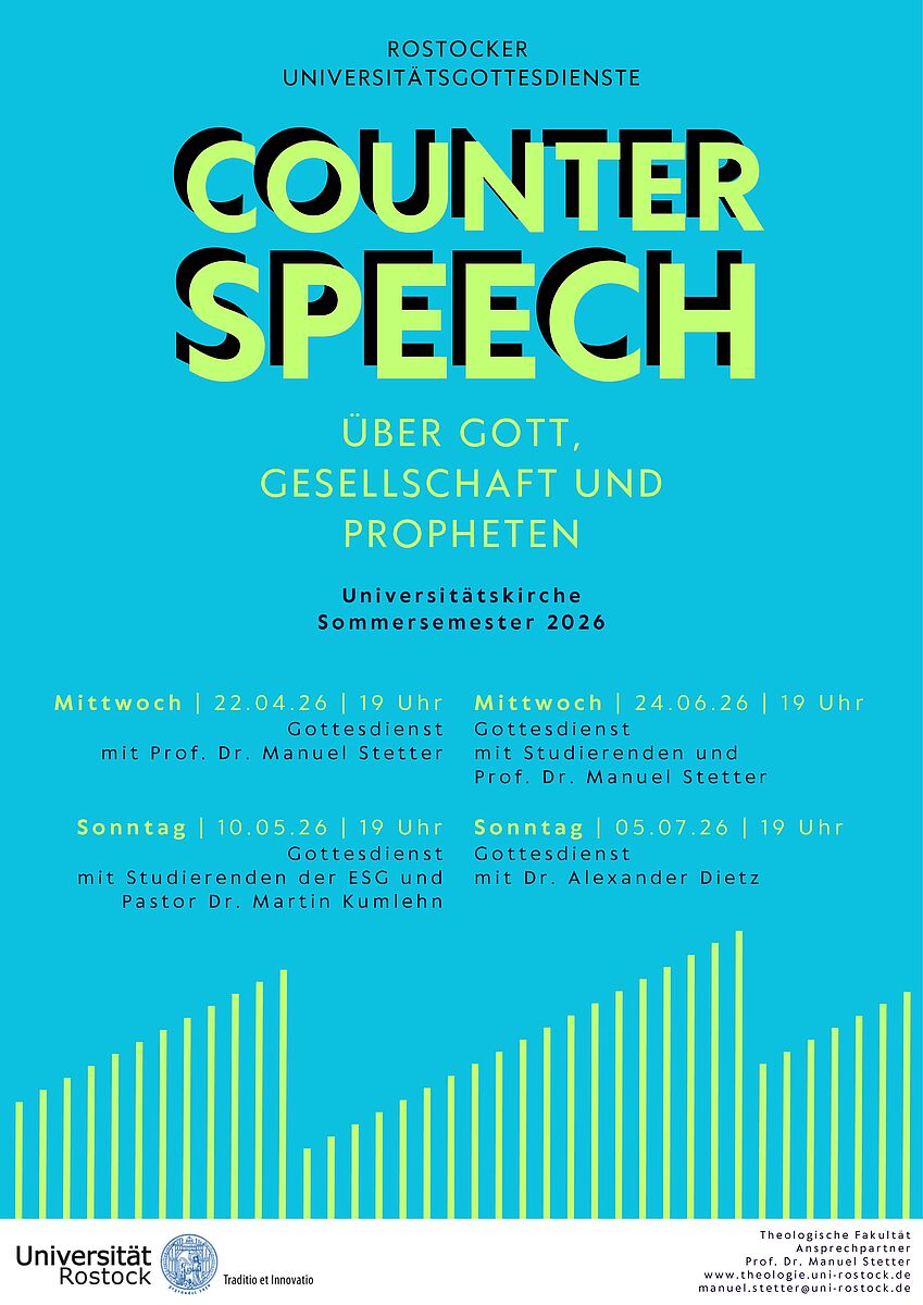 Evangelische Theologie in Rostock – das bedeutet: innovative Bearbeitung gegenwartsrelevanter Fragen, engagierte Lehrveranstaltungen, persönlicher Kontakt zwischen Lehrenden und Lernenden. Nutzen Sie die vielstimmigen Angebote theologischen Denkens und Arbeitens, die unsere Fakultät Ihnen bietet, und seien Sie herzlich willkommen auf unserer Homepage oder direkt an unserer Fakultät im Herzen der Hansestadt!